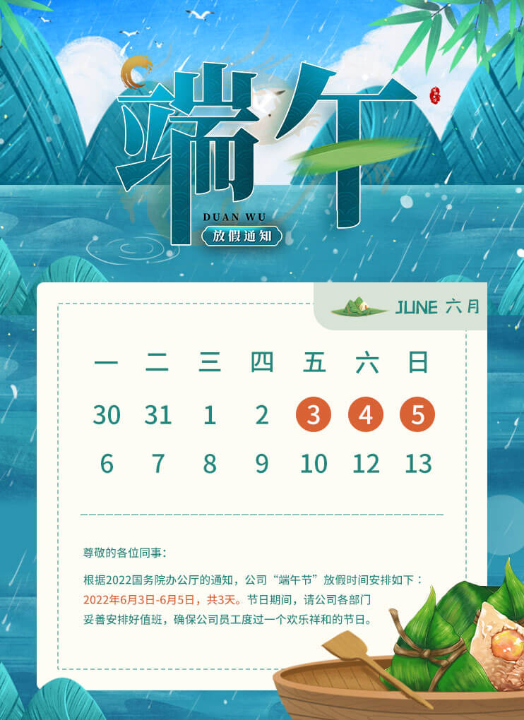 根据2022国务院办公厅的通知,公司“端午节”放假时间安排如下∶2022年6月3日-6月5日,共3天。 节日期间,请公司各部门妥善安排好值班,确保公司员工度过一个欢乐祥和的节日。