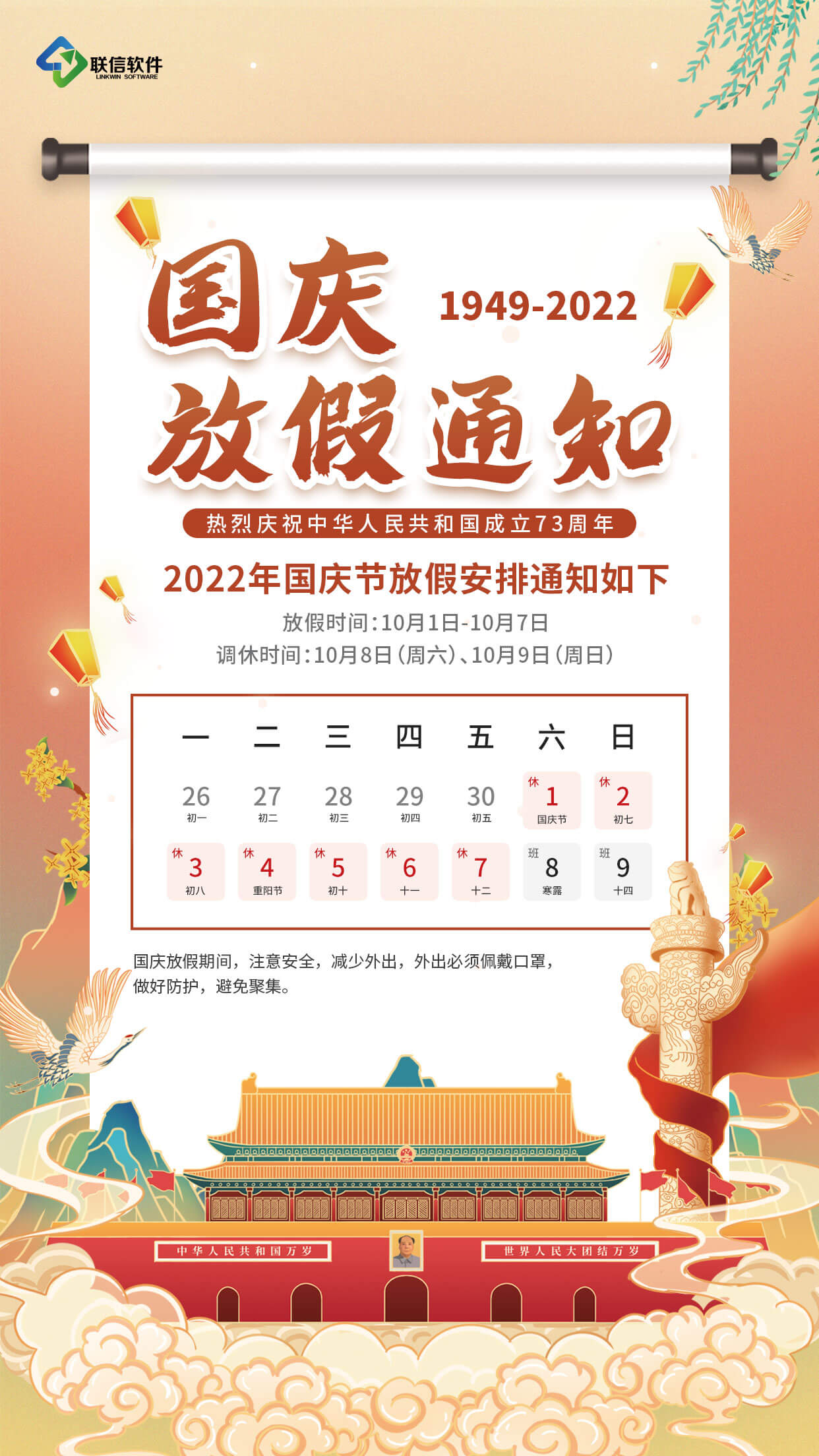 根据2022国务院办公厅的通知,公司“国庆节”放假时间安排如下∶2022年10月01日-10月07日,共7天。 节日期间,请公司各部门妥善安排好值班,确保公司员工度过一个欢乐祥和的节日。